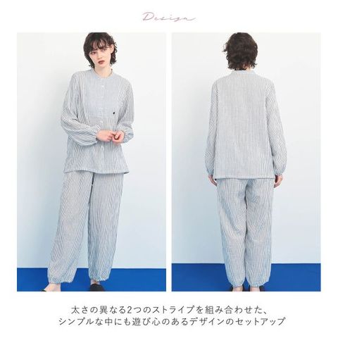 太さの異なる2つのストライプを組み合わせた、シンプルな中にも遊び心のあるデザインのセットアップ。ストライプ同士の色の重なりや視覚的なリズム感が、奥行きのある表情を生み出します。