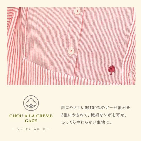 身生地は、柔らかな綿100%のダブルガーゼに繊細なシボを寄せたナルエーのオリジナルのシュークリームガーゼ(R)素材。生地に空気を含んだような、ふわっと包み込むような柔らかさが魅力です。