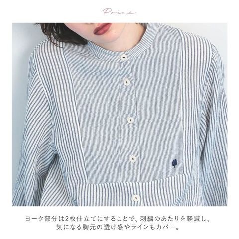 ヨーク部分は2枚仕立てにすることで、刺繍のあたりを軽減し、気になる胸元の透け感やラインもカバー。袖口はゴム入りで、まくりあげる時に便利です。
