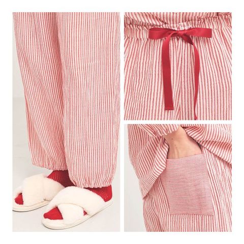 パンツは、トップスをインしても可愛いウエストリボン付き。ヒップにはアクセントでストライプを切り替えた大きめのポケットをつけています。