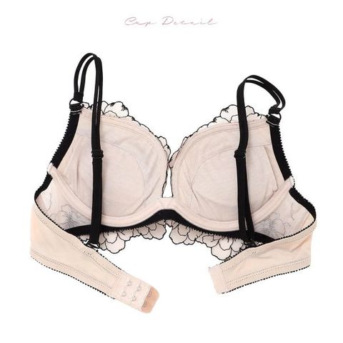 軽やかなラインで描いたお花のレースを使用した、フェミニンなデザインのブラジャー。土台にもセット柄レースをあしらい、華やかに。ピンクゴールドのプレートが、甘すぎず大人かわいいアクセントを添えています。