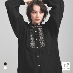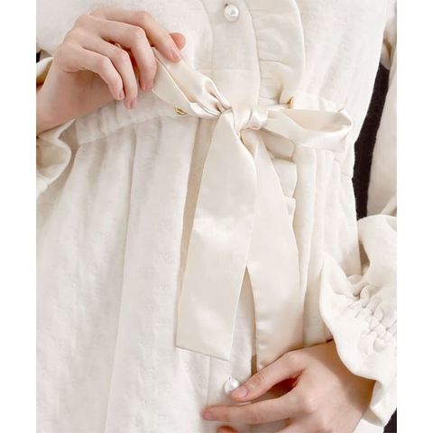 襟から前たてに続くフリル感とフロントの開き具合で、一枚で着ても綺麗に見えるでデザインに。