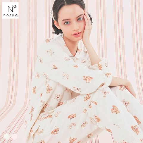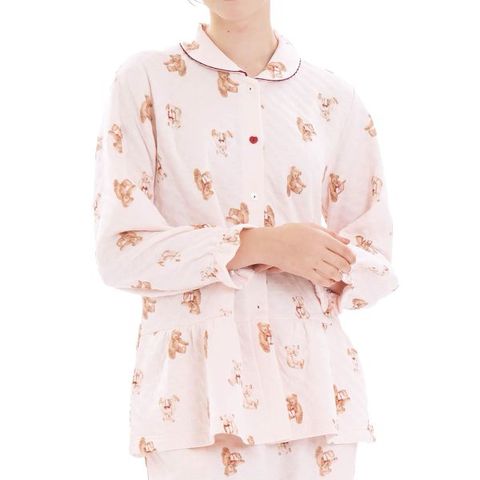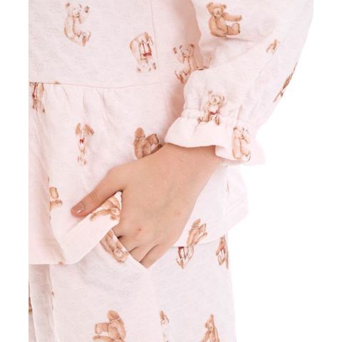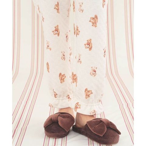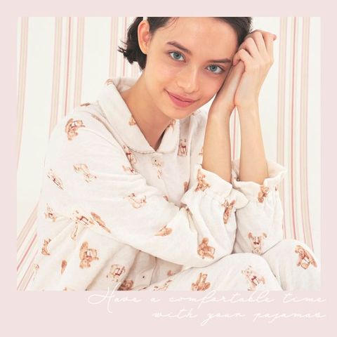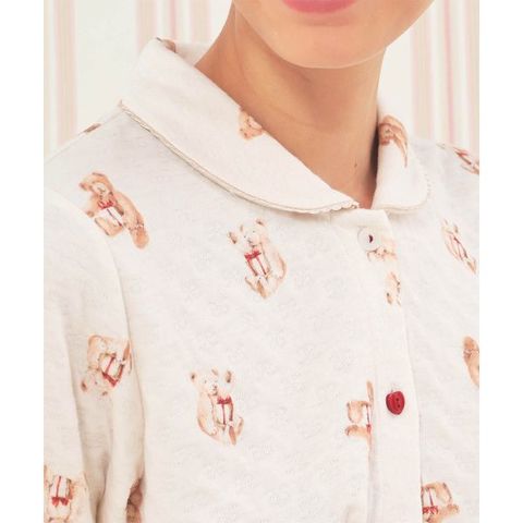 プレゼントを抱いたテディーベアをふんわりと優しいタッチで描いた、ノスタルジックな愛らしさが漂うパジャマ。