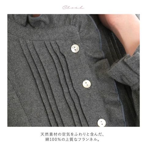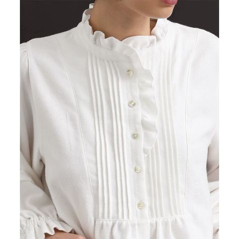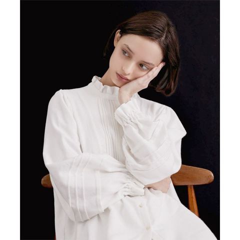 首にほどよく立ち上がるフリルは、ボタン位置を下げる事でリラックス感を出しているので、締め付け感なくご着用いただけます。