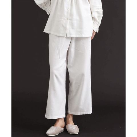 フロントに施された繊細なピンタックと貝ボタンが上品さを添え、襟元のフリルが顔まわりをやさしく彩るセットアップ。