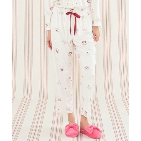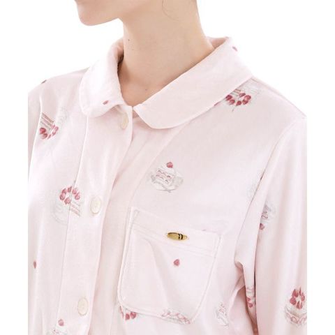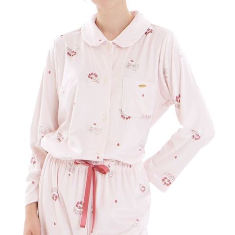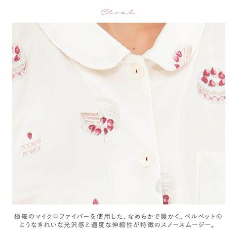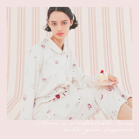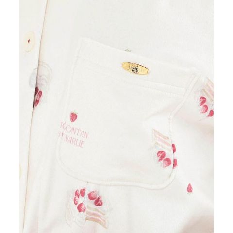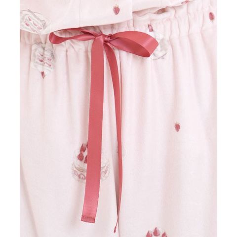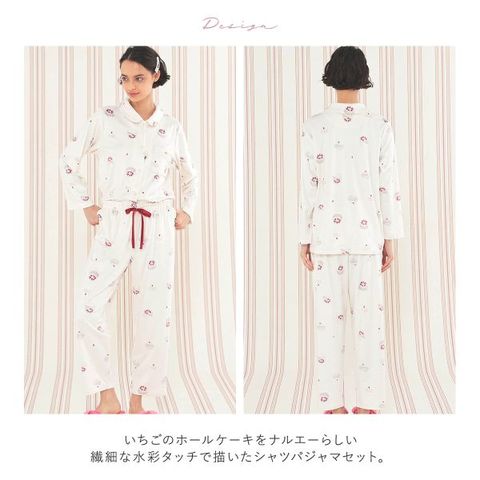 いちごのホールケーキをナルエーらしい繊細な水彩タッチで描いたシャツパジャマセット。パンツはウエストリボン付きで、インした時も可愛いデザインです。