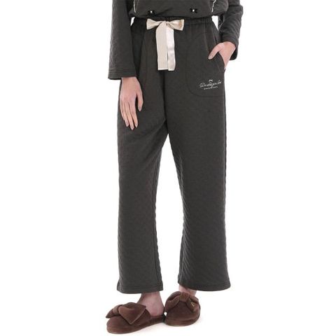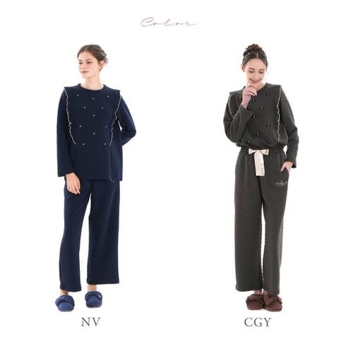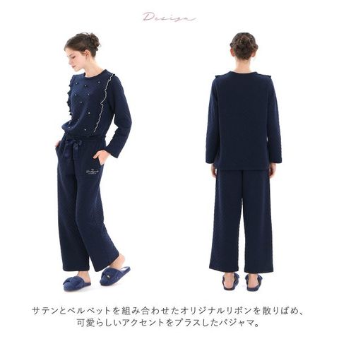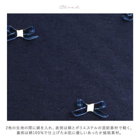 2枚の生地の間に綿を入れ、裏側は綿100%で仕上げた、お肌に優しいあったか接結素材のパジャマ。表側は綿とポリエステルの混紡素材で軽く、型崩れしにくい柔らかな素材感です。接結面の柄がリボンになっているのもキュートです。