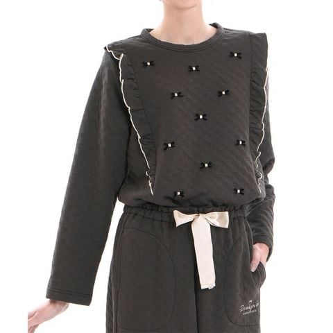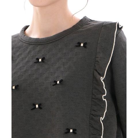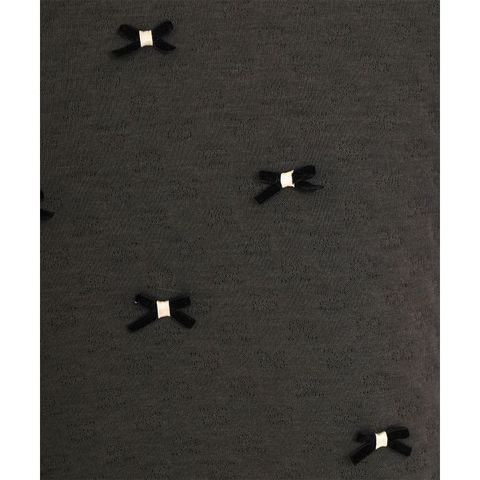 トップスは、サテンとベルベットを組み合わせたオリジナルリボンを散りばめ、可愛らしいアクセントをプラス。肩フリルは、内側につけることで、肩幅を華奢な印象に見せてくれます。