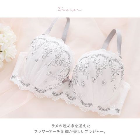 ラメの煌めきを湛えたフラワーアーチ刺繍が美しいブラジャー。