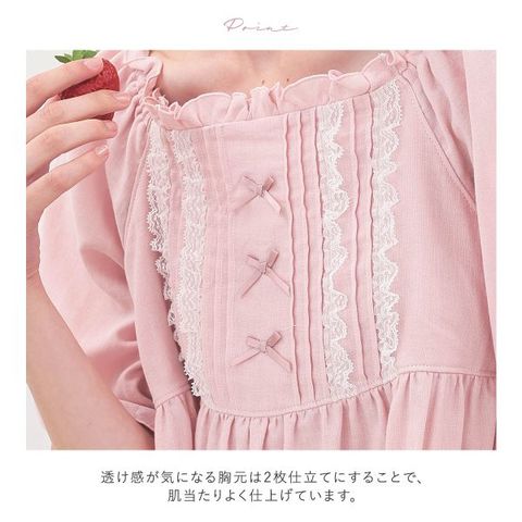 胸元のピンタックやレース、結びリボンなど、ロマンティックなディテールがポイントのナイトドレス。
