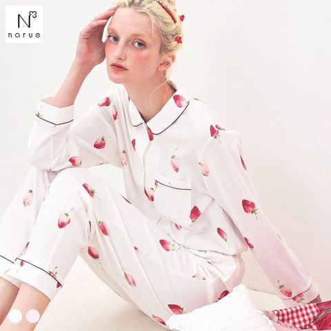みずみずしい大粒のいちごを繊細な水彩タッチで描いたシャツパジャマ上下セット。