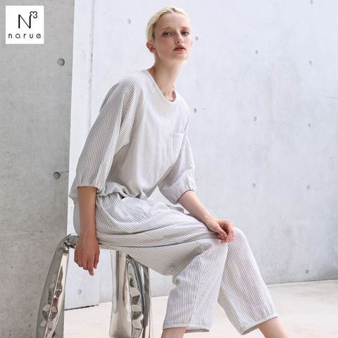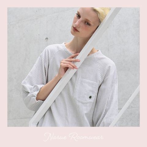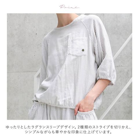 プルオーバーは、ゆったりとしたラグランスリーブデザイン。身頃と袖で大胆に2種類のストライプを切りかえ、シンプルながらも華やかな印象に仕上げています。