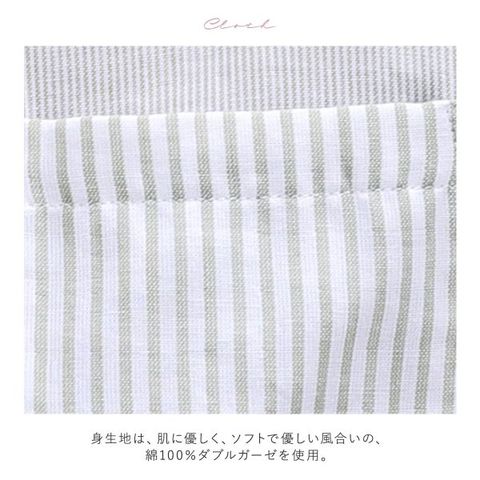 身生地には、肌に優しく、ソフトで優しい風合いの、綿100%ダブルガーゼを使用。洗うたびに柔らかさを増し、肌なじみがよくなるのが特長です。