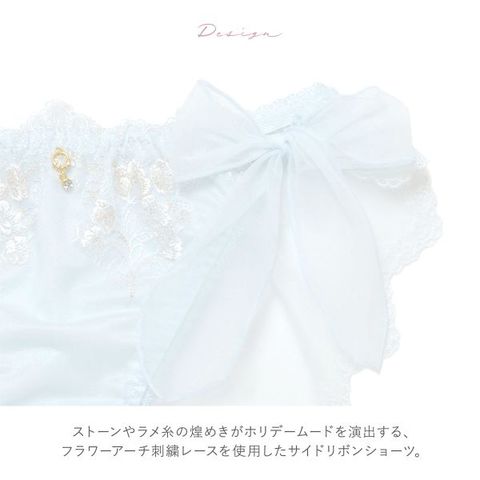 ストーンやラメ糸の煌めきがホリデームードを演出する、フラワーアーチ刺繍レースを使用したサイドリボンショーツ。