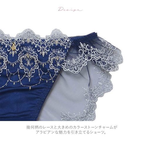 幾何柄のレースと大きめのカラーストーンチャームがアラビアンな魅力を引き立てるショーツ。