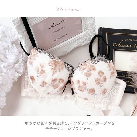 女性らしいフラワー刺繍と幾何学模様をスカラップにほどこし、華やかで印象に残るデザインに仕上げたブラジャーです。