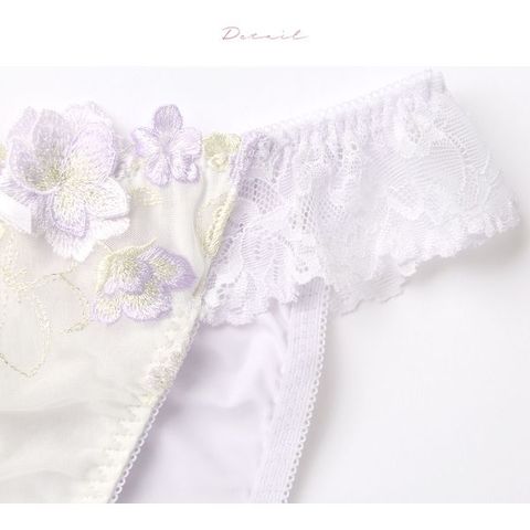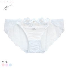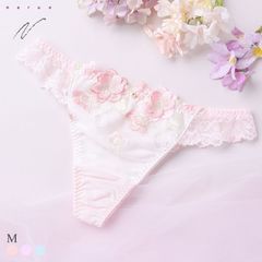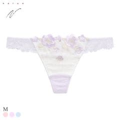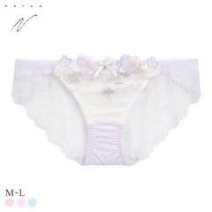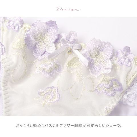 ぷっくりと艶めくパステルフラワー刺繍が可愛らしいショーツ。さり気ないラメ色の煌めきが美しく、ふわっと重なるアップリケが立体感と可憐な表情を演出します。