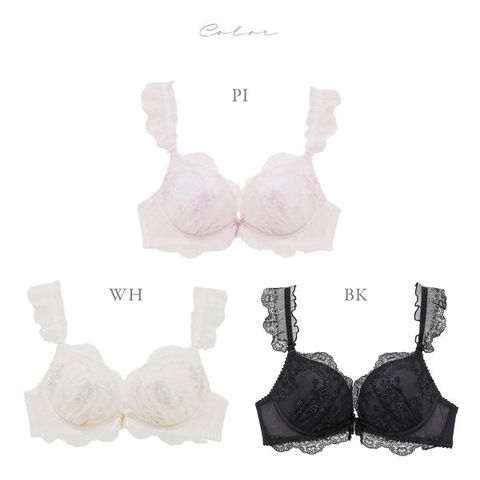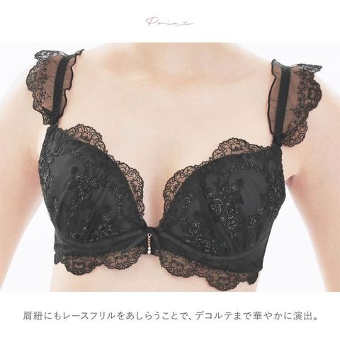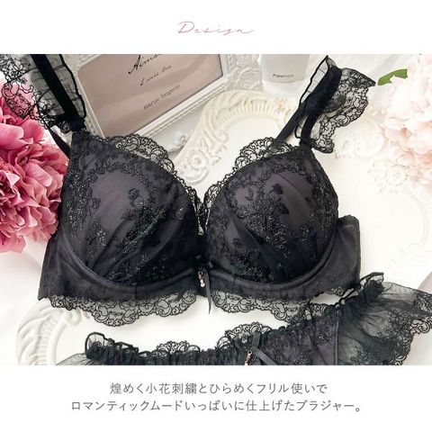 煌めく小花刺繍とひらめくフリル使いでロマンティックムードいっぱいに仕上げたブラジャー。肩紐にもレースフリルをあしらうことで、デコルテまで華やかに演出します。