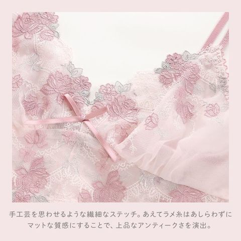 オールドローズでヴィンテージウェディングをイメージした「イーシャ」コレクション。手工芸を思わせるような繊細なステッチで花びら1枚1枚を刺しゅうしました。あえてラメ糸はあしらわずにマットな質感にすることで、上品なアンティークさを演出しています。