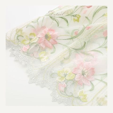 ハンガリーの伝統的なカロチャ刺しゅうをモチーフにした、リサマリレーヌ「テリン」コレクション。カラフルでインパクトのある大花模様をあしらったレースは、茎や葉はラフなステッチで、対照的に花びらはウーリー糸であしらうことで、ふっくらとした立体感と華やかさを表現。ポイントで特徴的な編み上げステッチをほどこすことで、よりクラフト感を演出しています。
