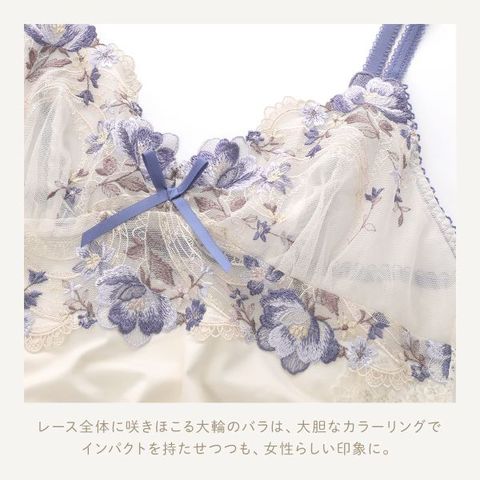 バラのお花と扇形模様を組み合わせた、リサマリレーヌ「サリー」コレクション。レース全体に咲きほこる大輪のバラは、大胆なカラーリングでインパクトを持たせつつも、女性らしい印象に。周りには様々な小花の刺繍や小さなアップリケをあしらい、可愛らしさをプラスしました。