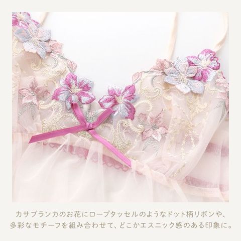 身生地はレース素材を使用している、透け感が美しいスリップ。さらりとした気持ちの良い着心地で、ワンピースなどのお洋服のインナーとしてもご着用いただけます。ストラップは長さ調節可能。バックスタイルにはギャザーフリルをあしらい、上品な可愛らしさをプラス。裾には豪華に刺繍をほどこし、華やかに仕上げています。