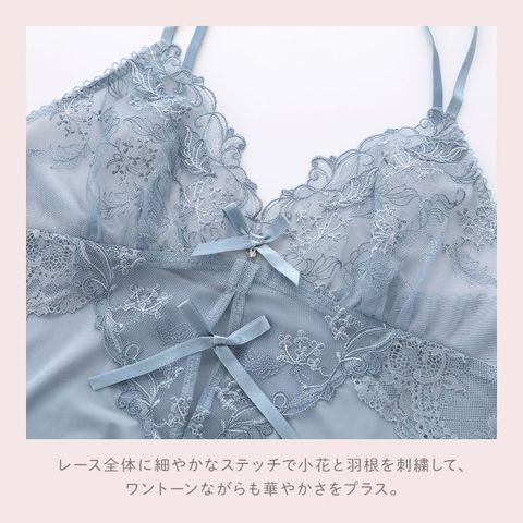 | 仕 様 | ・透感:レース部にあり ・カップなし ・肩紐調節:可能 ・スリット:バスト下にあり(リボン付き) ※生地の使用部分により、柄の出方が異なる場合がございます。予めご了承ください。 |