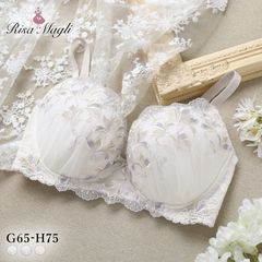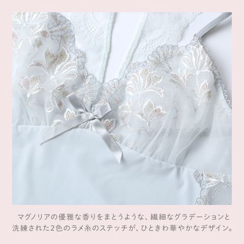 新しい季節の訪れを告げる、マグノリアをイメージした「リーゼル」コレクション。マグノリアの優雅な香りをまとうような、繊細なグラデーションと洗練された2色のラメ糸のステッチが、ひときわ華やかなデザイン。スカラップは小さなティアラのような幾何学模様をほどこし、優美な世界観を演出しています。