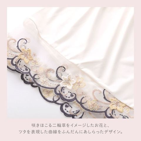 裾に繊細なレースをあしらったフェミニンなデザインのタップパンツ。ウエストはゴムでラクチンです。身生地はすべりがよい素材を使用しており、さらりとした気持ちの良い着心地です。伸縮性に優れているので、着用していてストレスを感じにくい仕様になっています。