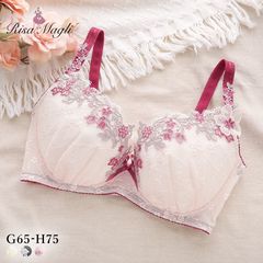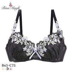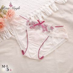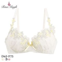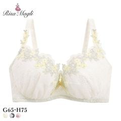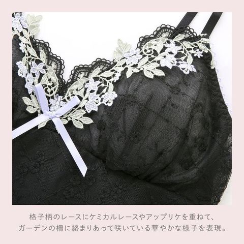 お花たちが咲きほこるガーデンをイメージしたレトロ感のあるデザインの、リサマリ「ジニー」コレクション。全体に小花を散りばめた格子柄のレースは、レースと同じカラーのあたたかみのあるウーリー糸で刺繍することで、ナチュラルな可愛らしさに。その上からクレマチスのお花をイメージしたケミカルレースと、ストラップにはアップリケを重ねて、お花たちがガーデンの柵に絡まり合って咲いている華やかな様子を表現しています。