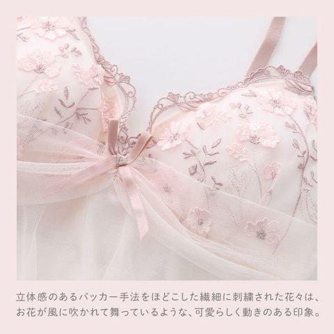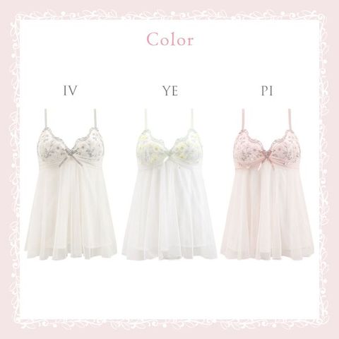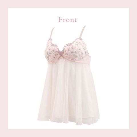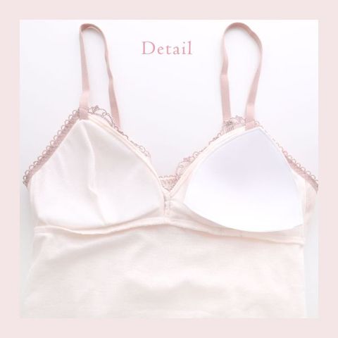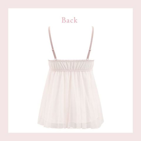 ふんわりエアリーなレース使いが可愛らしいカップ付きキャミソール。ストラップはアジャスターつきで長さの調節ができます。身生地はチュール素材を使用し、さらりとした気持ちの良い着心地。裏地は綿混素材で伸縮性があり、ご着用していてストレスを感じにくい仕様です。