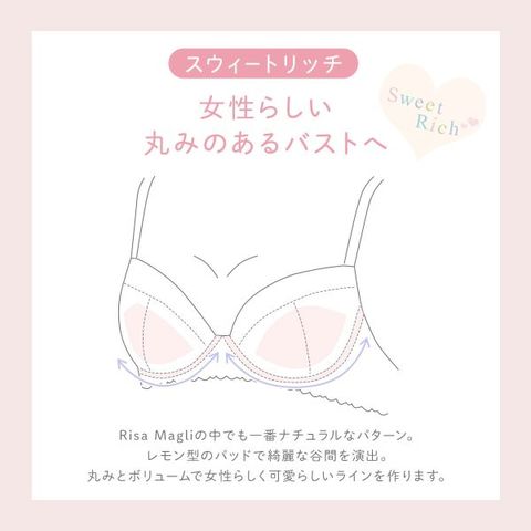 カップパターンは、ナチュラルな谷間と安定感、両方欲しい方におすすめのスウィートリッチパターンです。少し低めの土台があるため、安定感も兼ね備え、丸くて可愛い女性らしいシルエットを演出します。取り外し可能なパッドでボリューム調整もできます。