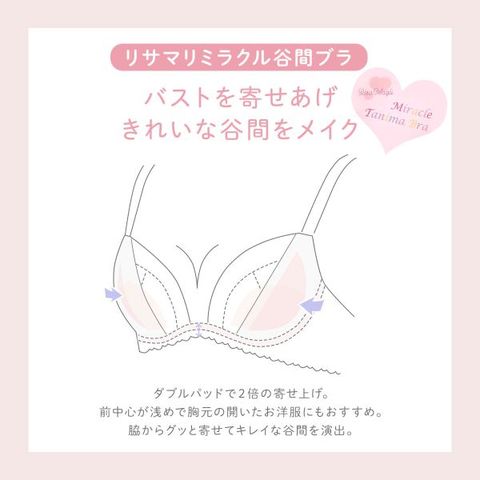 カップパターンは、Wパッドで2倍の寄せ上げが期待できる人気のリサマリミラクル谷間ブラパターンです。L字ワイヤーなのでバスト中心にワイヤーがくい込みにくく、着け心地がとても楽で、きれいな谷間を演出できます。
