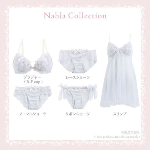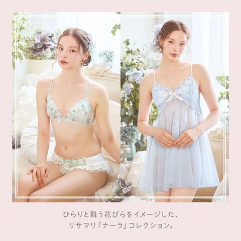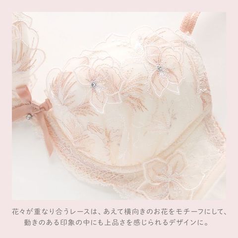 ひらりと舞う花びらをイメージした「ナーラ」コレクション。ラフなタッチで刺しゅうされた花々が重なり合うレースは、あえて正面ではなく横向きのお花をモチーフにして、動きのある印象の中にも上品さを感じられるデザインに。その上から輝くラインストーンをあしらったシアーアップリケを重ねることで、軽やかで涼しげな印象に仕上がりました。
