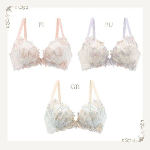 前中心が低いワイヤーとカップのサイドパネルで、バストを中央に寄せて美しいV字を演出する、V Make Typeパターンです。取り外し可能パッドでボリューム調整もできます。カップ裏のサイドには、脇に流れるバストを引き寄せるパネル付きで、脇もすっきり。