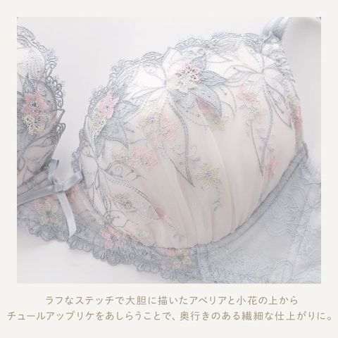 可憐に咲くアベリアのお花をイメージした、リサマリレーヌ「セレスティナ」コレクション。レースにはラフなステッチで大胆に描いたアベリアと小花を刺繍して、その上からお揃いのチュールアップリケをあしらうことで、奥行きのある繊細な仕上がりに。さらにツイード風の網目模様をほどこした小花のアップリケを重ねて、キラキラと輝くラメ糸とワンポイントのカラーリングが、お花がふわっと浮き出ている様子を可愛らしく表現しています。