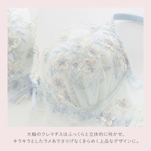 クレマチスの可憐な花々をモチーフに表現した、リサマリ「フリート」コレクション。アンダー部分にあしらわれたギャザーたっぷりの軽やかなチュールレースがキュートな印象です。大輪のクレマチスは、パッカー手法でふっくらと立体的に咲かせ、キラキラとしたラメ糸でさりげなくきらめく上品なデザインに。