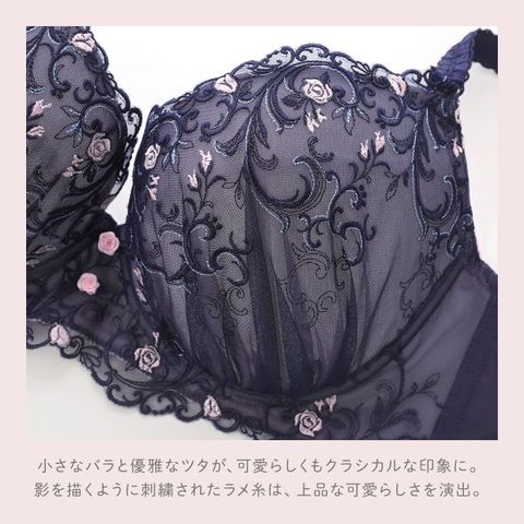ヨーロッパの宮殿の壁画をイメージした「シュテファニ」コレクション。小さなバラと優雅なツタが、可愛らしくもクラシカルな印象に。影を描くように刺繍されたラメ糸は、ほのかにきらめいて上品な可愛らしさを演出。カップ中央には立体的なバラのモチーフをあしらい、特別感をプラスしました。まるで夢見る少女のような、甘く優雅な世界観を演出するコレクションです。