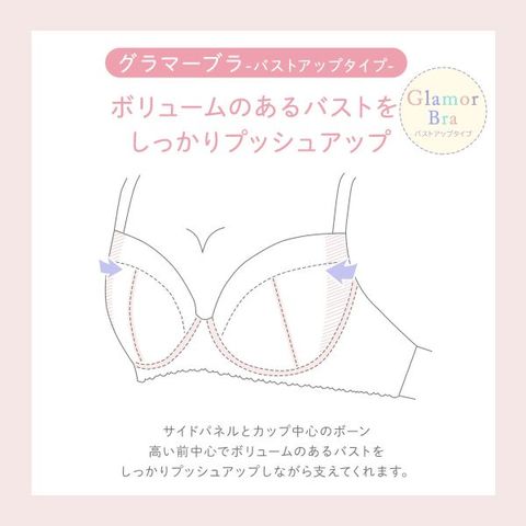 ボリュームのあるバストのためのグラマーブラ(バストアップタイプ)です。カップサイドのパネルで脇流れを防ぎしっかり固定。また、カップ中央部分にボーンを入れることにより、バストをしっかり支えてくれます。パッドポケット付きなので、お手持ちのパッドでボリュームを調整できます。ホックは3段3列なので安定感があります。