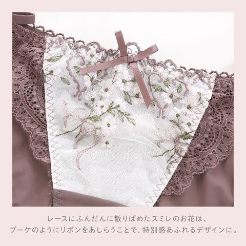 スミレのお花のブーケをイメージした、リサマリ「リア」コレクション。レースにふんだんに散りばめたスミレのお花は、ブーケのように束ねて揺れるリボンをあしらうことで、自分へのギフトのような特別感あふれるデザインに仕上がりました。