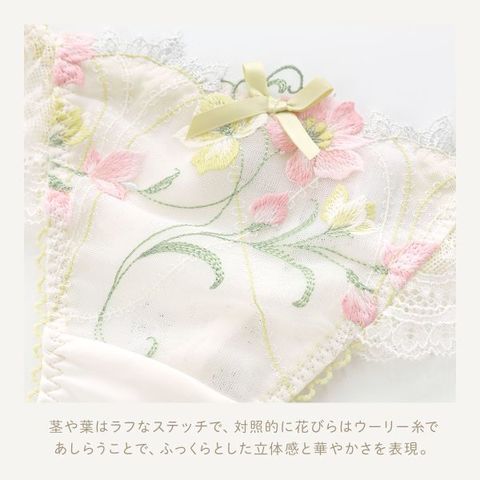 | 仕 様 | ・伸縮性:バックは縦横にあり ・クロッチ:付き ・透感:レース部にあり ※生地の使用部分により、柄の出方が異なる場合がございます。予めご了承ください。 |
