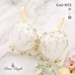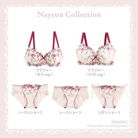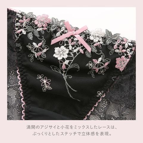 アジサイと小花をモチーフにした「ナヨン」コレクション。満開のアジサイと小花をミックスしたレースは、ぷっくりとしたステッチで立体感を表現。長い茎を交差させることで、柄行きにさりげなく動きをプラスしています。