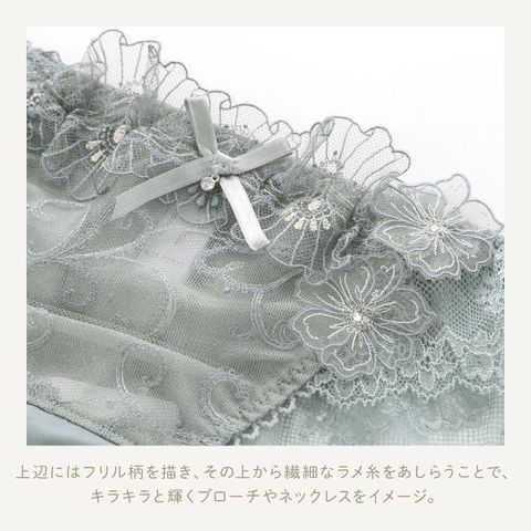 バレエの世界観をイメージしながら、チュールの軽やかさとラメのきらめきを軸にデザインしたリサマリレーヌ「リタ」コレクション。上辺にはフリル柄を描き、その上から繊細なラメ糸をあしらうことで、キラキラと輝くブローチやネックレスをイメージ。たっぷりとフリルを寄せて、バレリーナのチュチュのような立体感を演出しました。