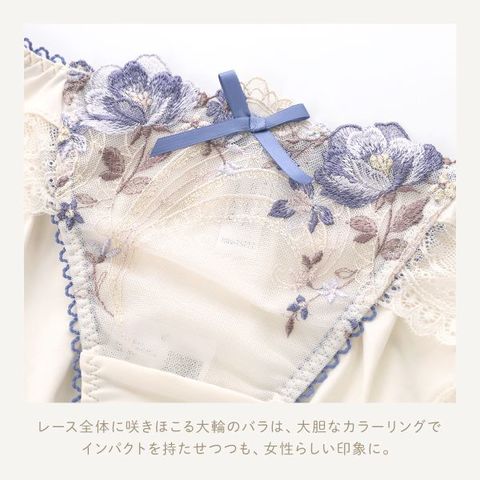バラのお花と扇形模様を組み合わせた、リサマリレーヌ「サリー」コレクション。レース全体に咲きほこる大輪のバラは、大胆なカラーリングでインパクトを持たせつつも、女性らしい印象に。周りには様々な小花の刺繍をあしらい、可愛らしさをプラスしました。