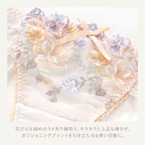 西洋絵画をイメージした、ポジショニングプリントを贅沢にほどこしたシリーズ、リサマリレーヌ「ジェシー」コレクション。花びらは細めのラメ糸で縁取り、キラキラと上品な輝きが、ポジショニングプリントを引き立たせる儚い印象に仕上がりました。スモーキーで落ち着きのあるカラーリングで、自分だけのアートを身に着けるような特別感を演出します。