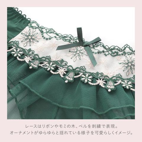 キラキラと揺れるオーナメントをモチーフにした、リサマリ「ルビー」コレクション。レースには窓辺に飾られているリボンやモミの木、ベルや鈴を刺繍で表現。オーナメントがゆらゆらと揺れている様子を可愛らしく描いています。窓の外に降り積もる雪の結晶を、たっぷりのラメ糸で豪華にあしらいました。