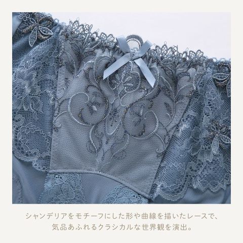煌びやかな宮殿の装飾をイメージした、リサマリレーヌ「アリーナ」コレクション。シャンデリアをモチーフにした形や曲線を描いたレースで、気品あふれるクラシカルな世界観を演出。全体に輝くラメ糸を刺繍して、繊細にステッチを変化させることで、ワントーンの中にも動きのある印象に。レース上辺には小さなお花をあしらい、さりげない可愛らしさをプラスしています。