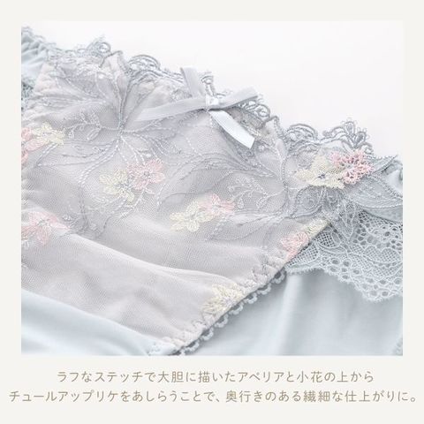 可憐に咲くアベリアのお花をイメージした、リサマリレーヌ「セレスティナ」コレクション。レースにはラフなステッチで大胆に描いたアベリアと小花を刺繍して、その上からお揃いのチュールアップリケをあしらうことで、奥行きのある繊細な仕上がりに。さらにツイード風の網目模様をほどこした小花のアップリケを重ねて、キラキラと輝くラメ糸とワンポイントのカラーリングが、お花がふわっと浮き出ている様子を可愛らしく表現しています。