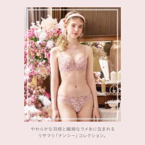 ふんわりとした羽根をイメージしたデザインと、繊細なラメ糸を上品にミックスさせた、リサマリ「ナンシー」コレクション。レース全体に細やかなステッチで小花と羽根を刺繍して、ワントーンながらも華やかさをプラス。その上からふわふわと舞い落ちたような羽根のアップリケをあしらうことで、立体感と儚さを演出しました。