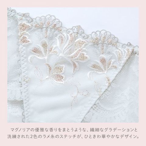 新しい季節の訪れを告げる、マグノリアをイメージした「リーゼル」コレクション。マグノリアの優雅な香りをまとうような、繊細なグラデーションと洗練された2色のラメ糸のステッチが、ひときわ華やかなデザイン。スカラップは小さなティアラのような幾何学模様をほどこし、優美な世界観を演出しています。
